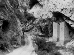 Поправьте меня кто может, но насколько я знаю, сто лет назад еще не устанавливали защитные бетонные ограждения по бокам дороги, чтобы автомобиль не свалился в ущелье. А тут на фотографии они прекрасно видны. Время автомобилей, конечно же, тогда уже наступило, но вряд ли автомобиль как средство передвижения, а не роскошь докатился до Итум-Калинского района настолько, что начали устанавливать бетонные ограждения. Так что фотография явно не 1910 года.